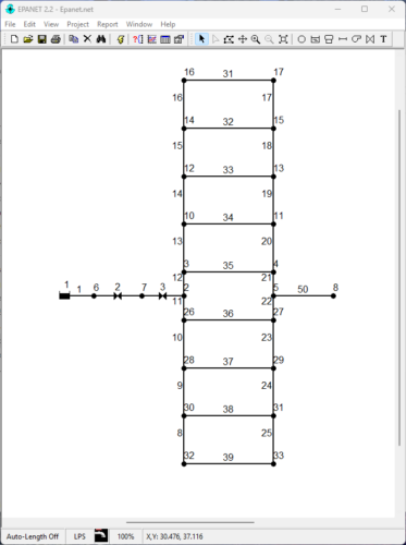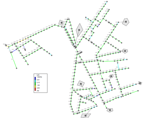 EPANET is a software application developed by the U.S. Environmental Protection Agency (EPA) used for the design and verification of water distribution systems. In EPANET the distribution networks, which can also present a complex topology, are represented as a set of links and nodes. The software simulates both the water flow and water quality in each node and link of the network. The typical outputs from the calculations are: the flow rates in nodes and links, the fluid velocity, the pressure in each node, the concentration of dissolved chemical constituents, and reservoir levels.