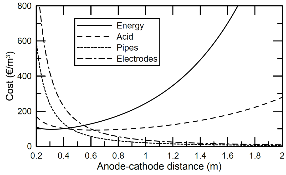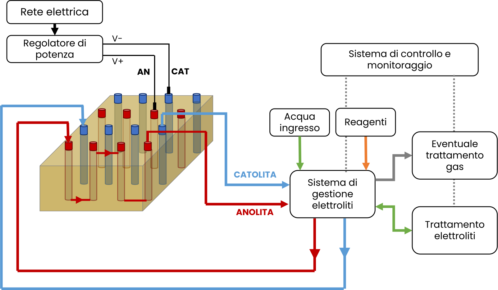 Nelle applicazioni in piena scala, il campo elettrico viene applicato mediante gruppi di elettrodi collocati all’interno di pozzetti verticali a pareti porose inseriti nel materiale da trattare in cui viene fatta circolare acqua opportunamente condizionata (gli elettroliti).