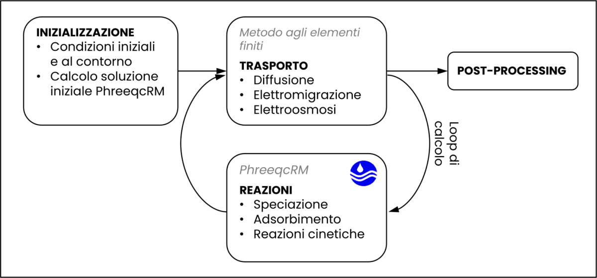 I principali fenomeni modellati sono: (1) il trasporto degli inquinanti per diffusione, elettromigrazione ed elettroosmosi, (2) l'interazione tra inquinanti e il mezzo poroso (reazioni chimiche, precipitazione, dissoluzione, speciazione), (3) le reazioni che avvengono agli elettrodi (ad esempio, l'elettrolisi dell'acqua). Il calcolo delle reazioni geochimiche, sia all'equilibrio sia cinetiche, è simulato con il software PHREEQC che dispone di un ampio database di parametri di specie disciolte e in fase solida. Le equazioni di trasporto sono risolte con il metodo FEM (metodo degli elementi finiti) utilizzando software commerciali (ad esempio, COMSOL) o open source (ad esempio, FEniCS).