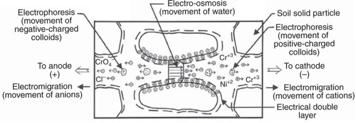 Il campo elettrico induce il movimento di inquinanti, particelle cariche, ioni e del fluido all’interno dei pori del mezzo poroso verso gli elettrodi, grazie a tre principali meccanismi di trasporto: